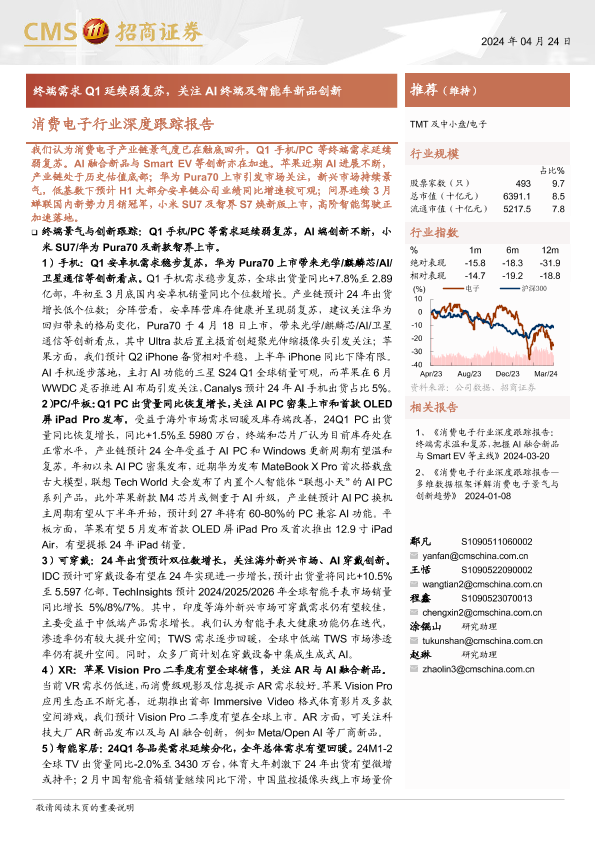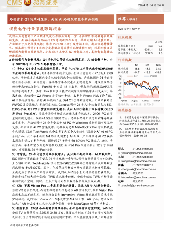 【海通证券】【20240424】消费电子行业深度跟踪报告:终端需求Q1延续弱复苏,关注AI终端及智能车新品创新-75页
