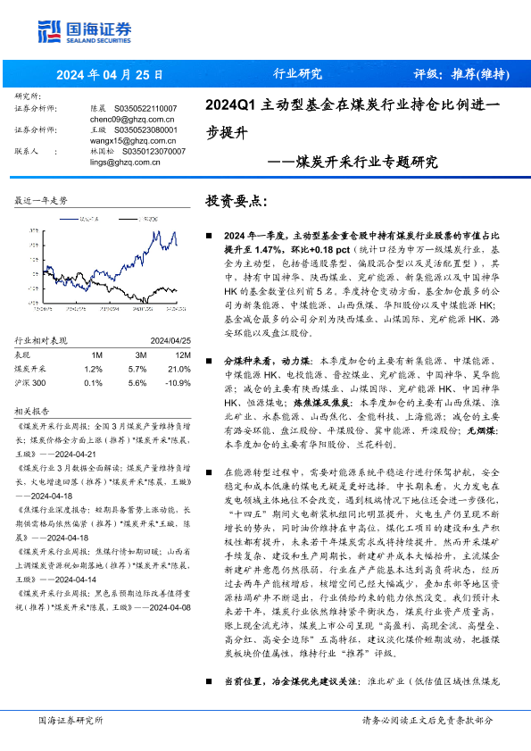 【国海证券】【20240425】煤炭开采行业专题研究:2024Q1主动型基金在煤炭行业持仓比例进一步提升-11页