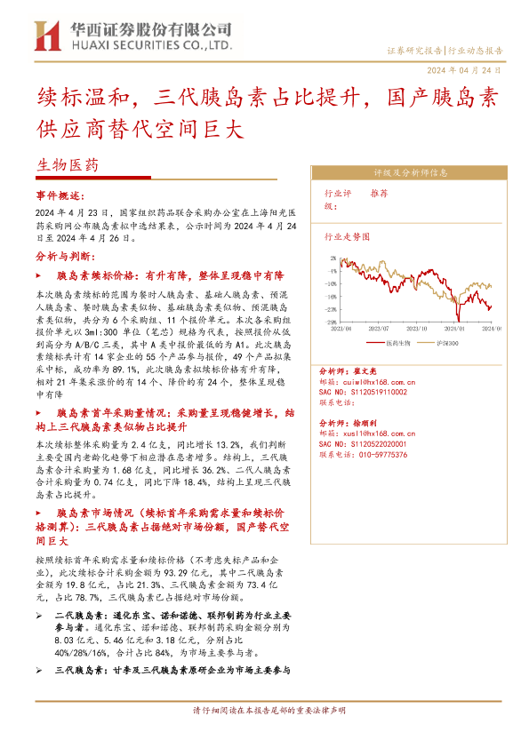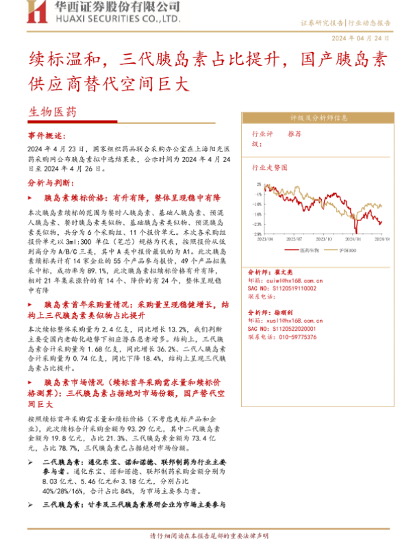 【华西证券】【20240424】生物医药行业:续标温和,三代胰岛素占比提升,国产胰岛素供应商替代空间巨大-11页
