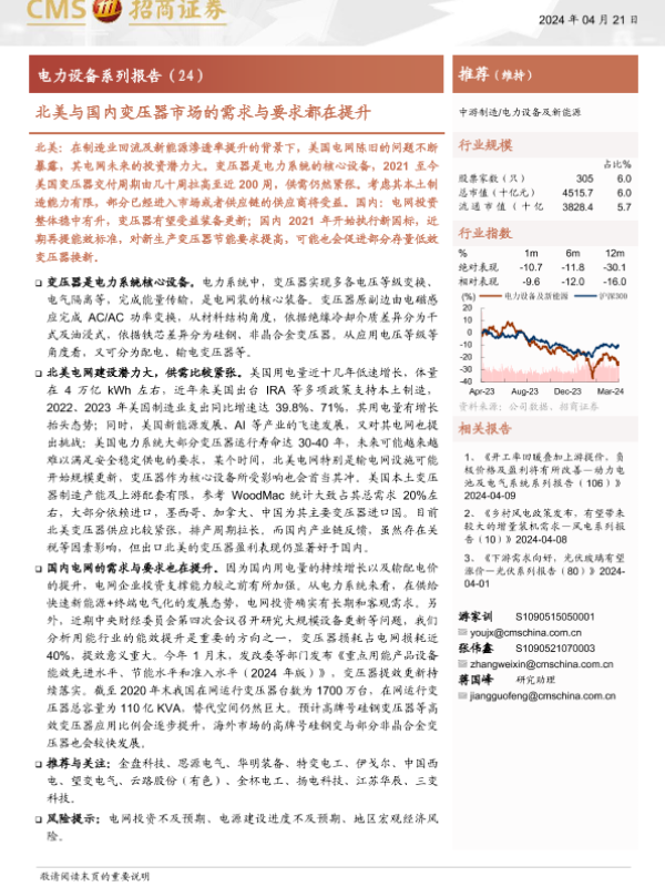 【海通证券】【20240421】电力设备及新能源行业电力设备系列报告(24):北美与国内变压器市场的需求与要求都在提升-20页