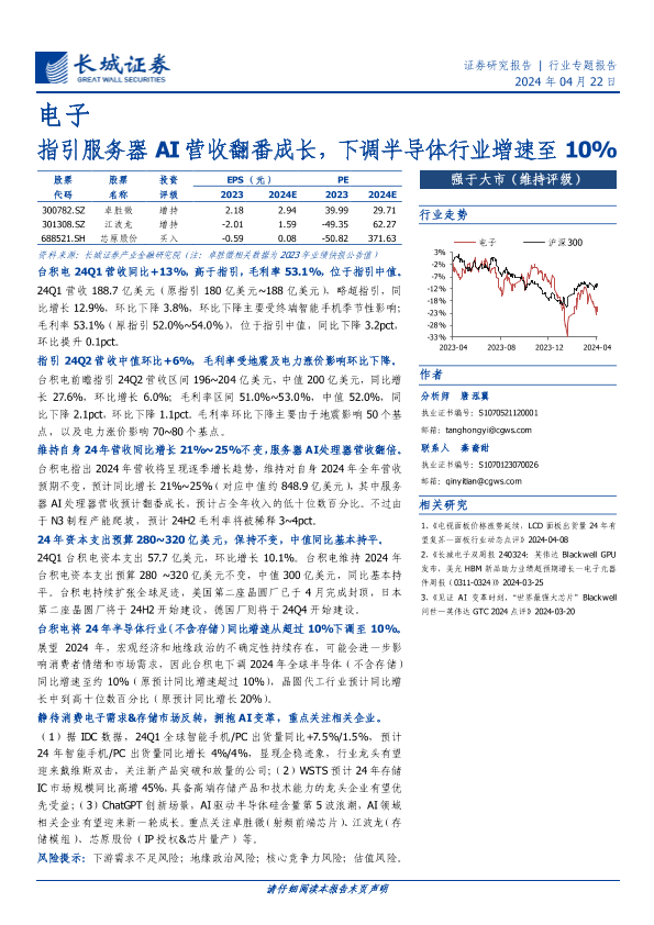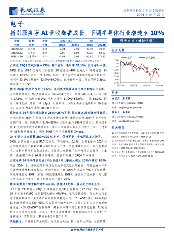 【长城证券】【20240422】电子行业:指引服务器AI营收翻番成长,下调半导体行业增速至10%-14页