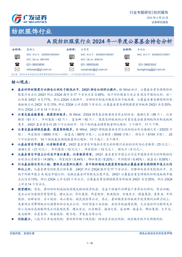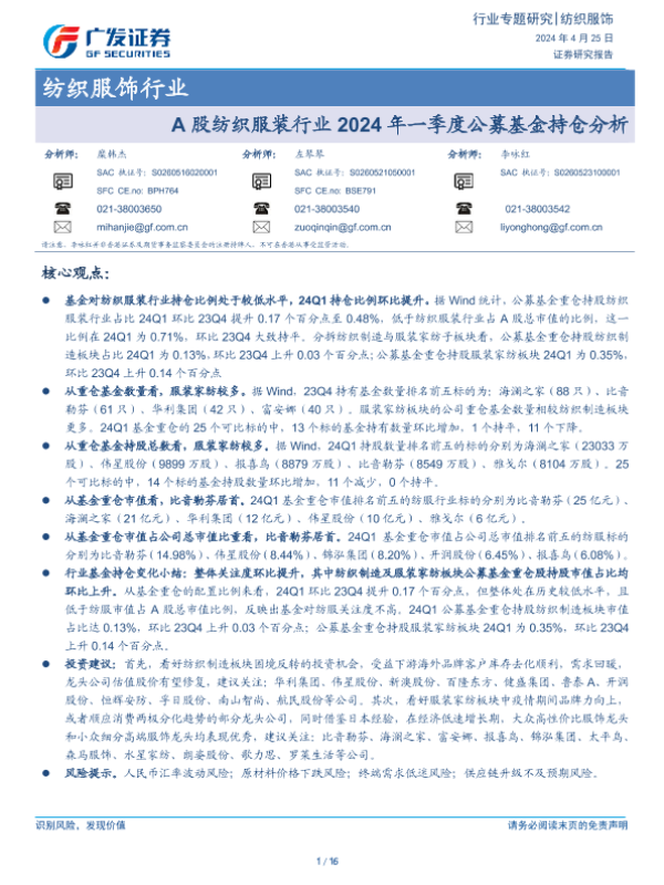 【广发证券】【20240425】A股纺织服装行业2024年一季度公募基金持仓分析-16页