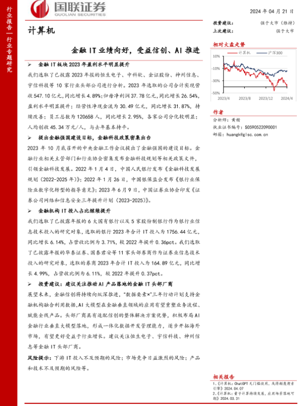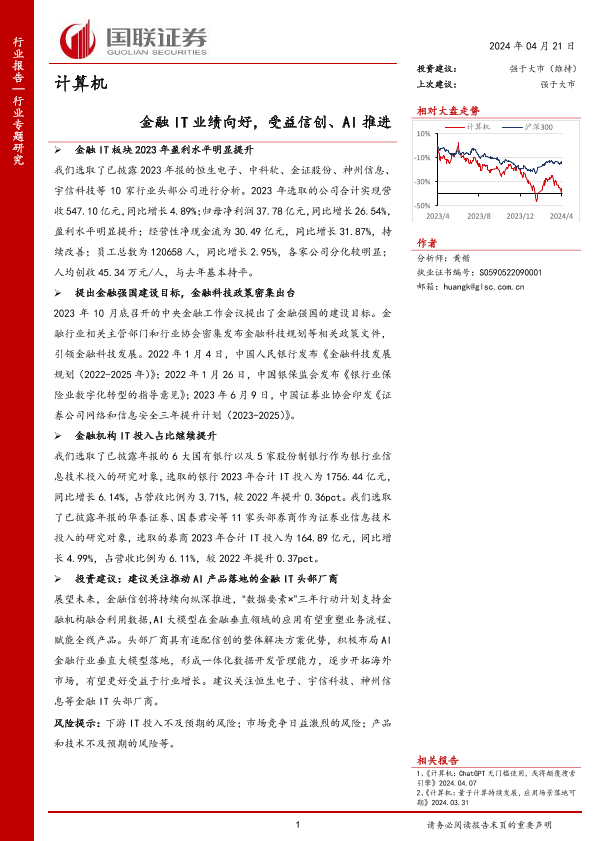 【国联证券】【20240421】计算机行业专题研究:金融IT业绩向好,受益信创、AI推进-15页