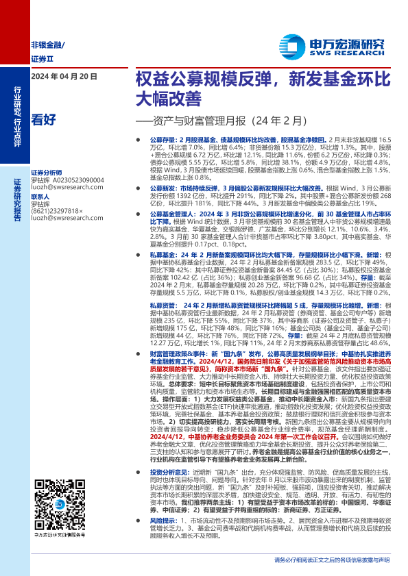 【申万宏源】【20240420】证券行业资产与财富管理月报(24年2月):权益公募规模反弹,新发基金环比大幅改善-19页