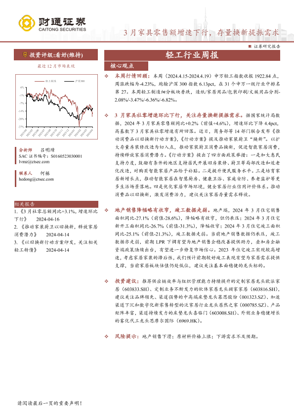【财通证券】【20240421】3月家具零售额增速下行,存量换新提振需求-13页