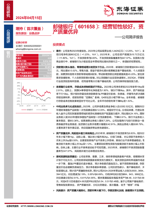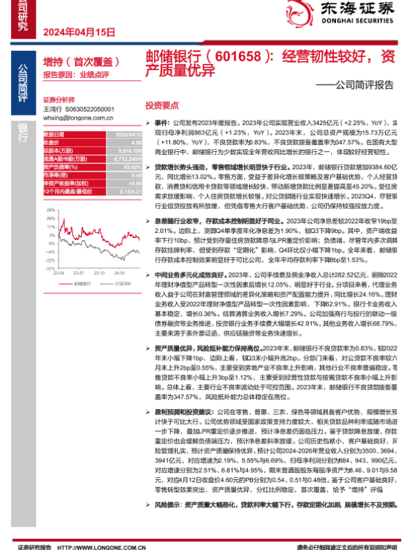 【东海证券】【20240415】邮储银行-601658.SH-公司简评报告:经营韧性较好,资产质量优异-13页