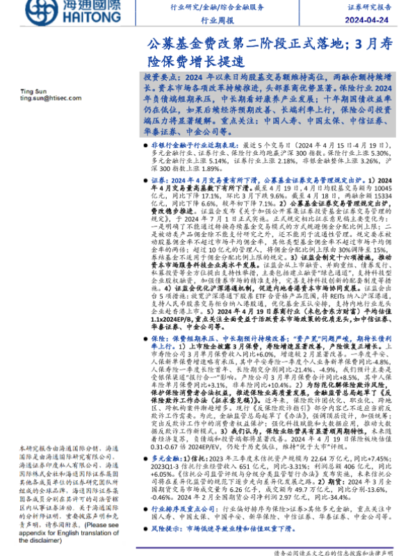 【海通国际】【20240424】金融行业:公募基金费改第二阶段正式落地;3月寿险保费增长提速-19页