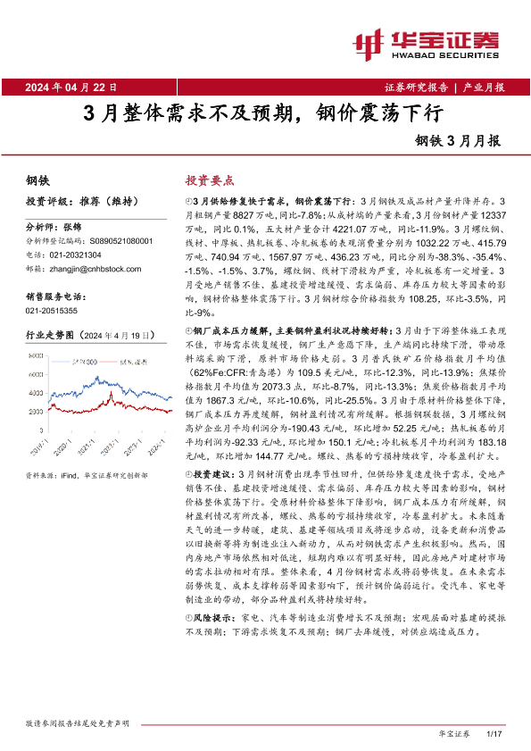 【华宝证券】【20240422】钢铁3月月报:3月整体需求不及预期,钢价震荡下行-17页