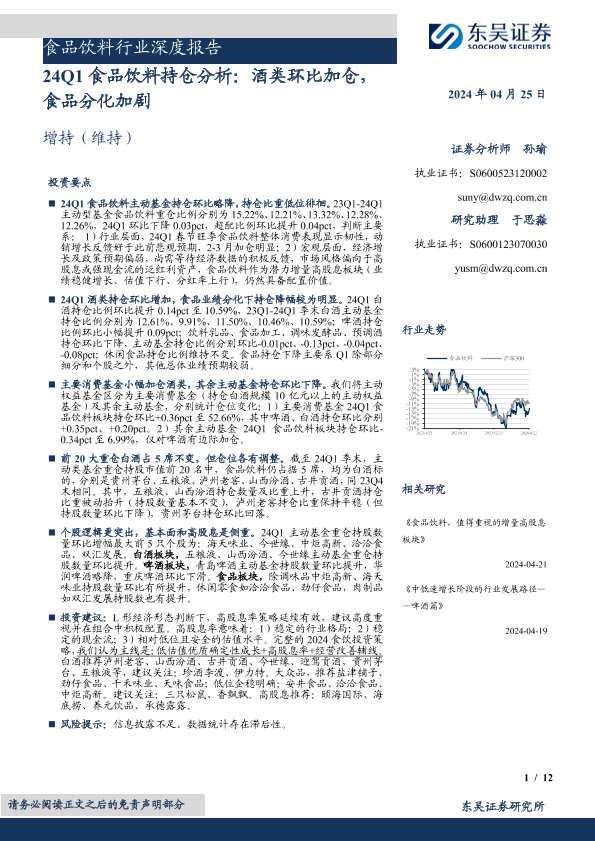 【东吴证券】【20240425】食品饮料行业深度报告:24Q1食品饮料持仓分析,酒类环比加仓,食品分化加剧-12页