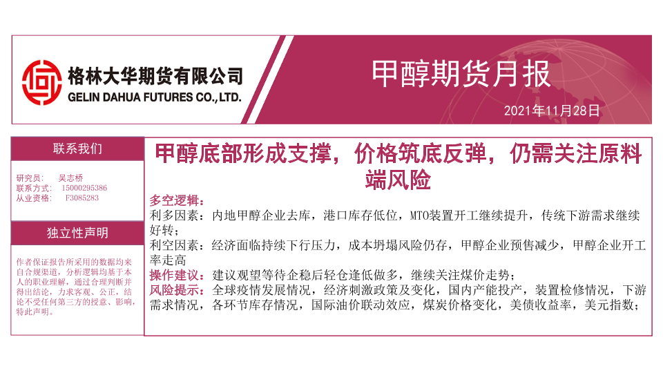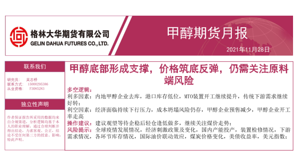【格林大华期货】【20211128】甲醇期货月报:甲醇底部形成支撑,价格筑底反弹,仍需关注原料端风险-28页