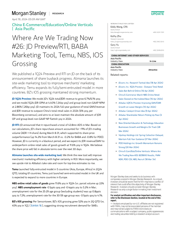 【Morgan Stanley】【20240418】中国电子商务、教育及在线垂直领域现状#26:JD预览/RTI,阿里妈妈营销工具,Temu,NBS,iOS收入-14页