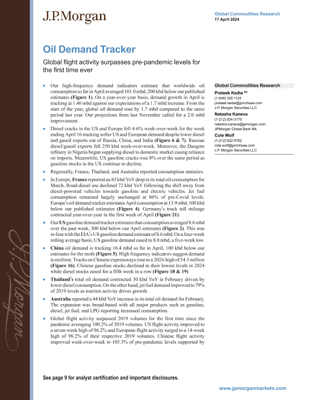 【J.P. Morgan】【20240417】JPMorgan Econ FI-Oil Demand Tracker Global flight activity surpasses pre-pandemic levels-12页