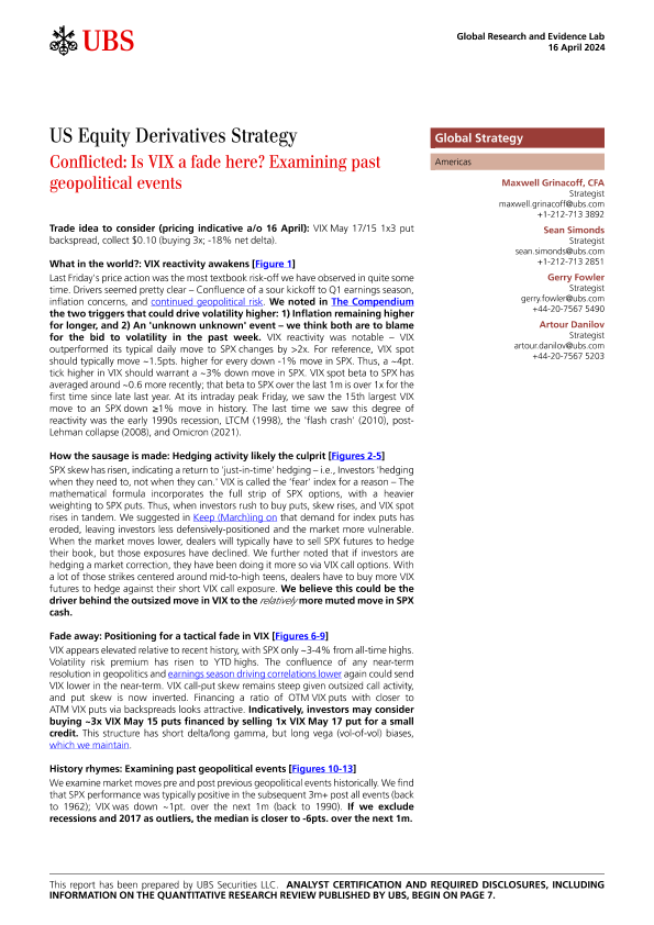 【UBS Securities LLC】【20240416】US Equity Derivatives Strategy Conflicted Is VIX a fade here? Examining past geopolitical events-10页
