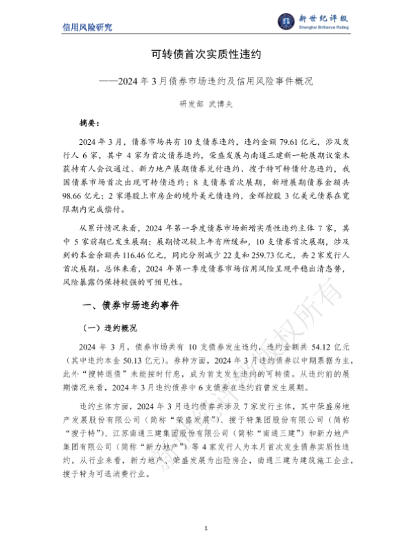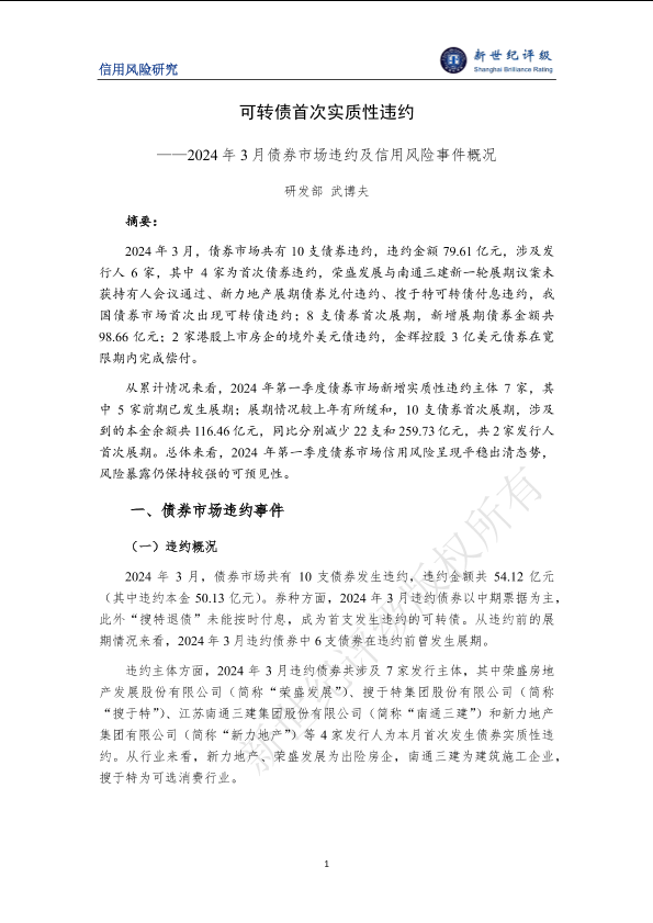 【研发部 武博夫】【202403】可转债首次实质性违约——2024年3月债券市场违约及信用风险事件概况-11页
