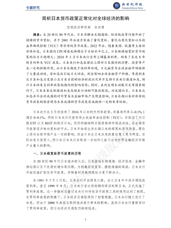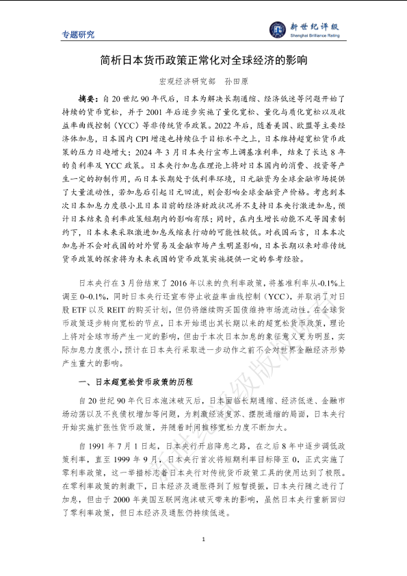 【宏观经济研究部 孙田原】【202403】简析日本货币政策正常化对全球经济的影响-7页