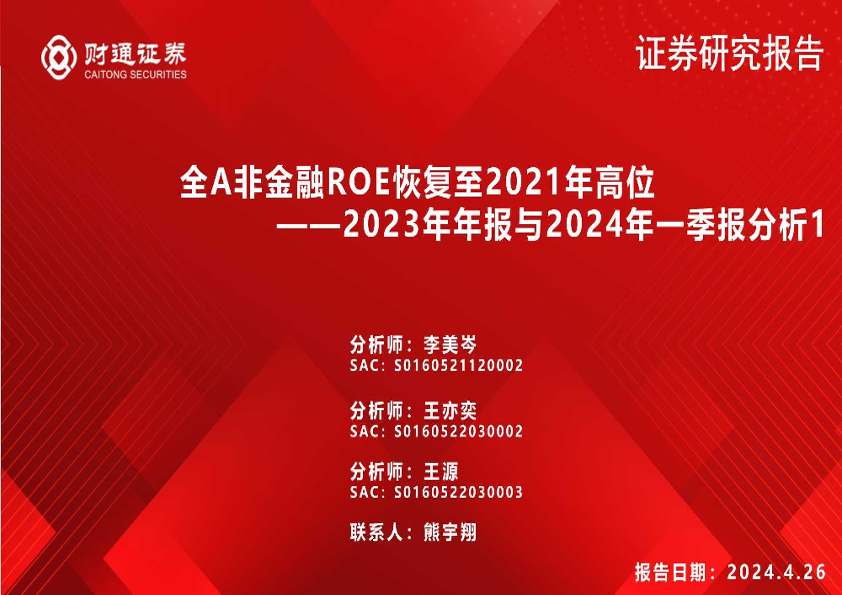 【财通证券】【20240426】2023年年报与2024年一季报分析1:全A非金融ROE恢复至2021年高位-22页