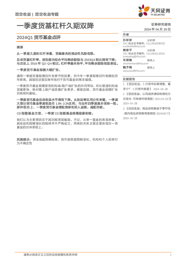 【天风证券】【20240429】2024Q1货币基金点评:一季度货基杠杆久期双降-10页
