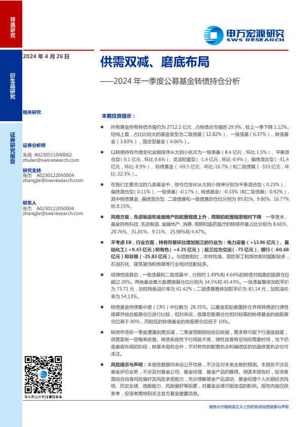 【申万宏源】【20240426】2024年一季度公募基金转债持仓分析:供需双减、磨底布局-14页