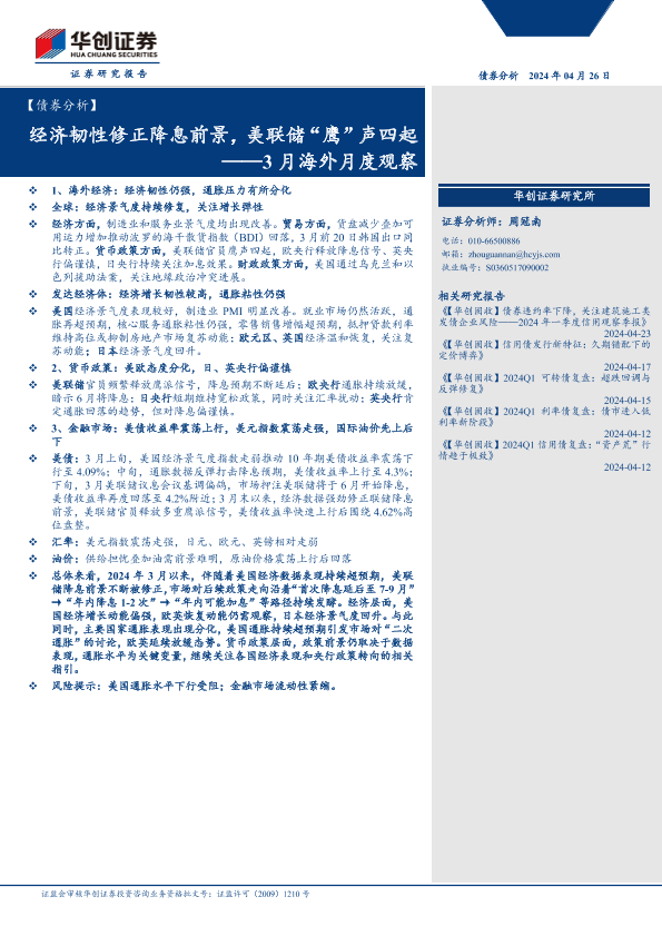 【华创证券】【20240426】3月海外月度观察:经济韧性修正降息前景,美联储“鹰”声四起-20页