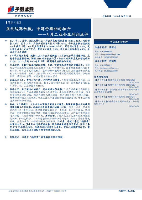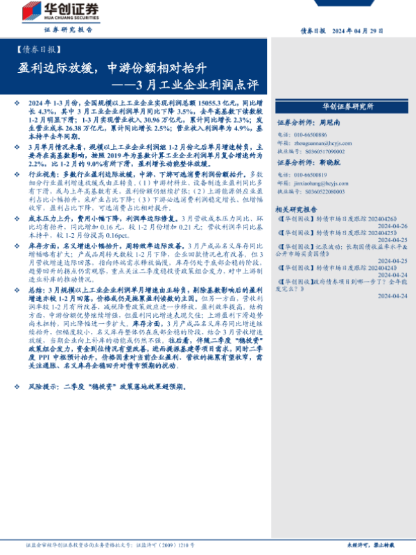 【华创证券】【20240429】【债券】3月工业企业利润点评:盈利边际放缓,中游份额相对抬升-12页