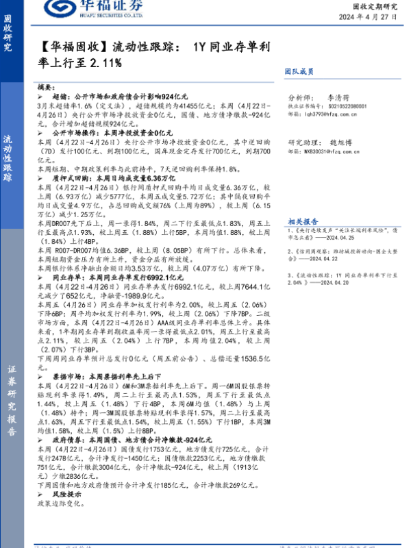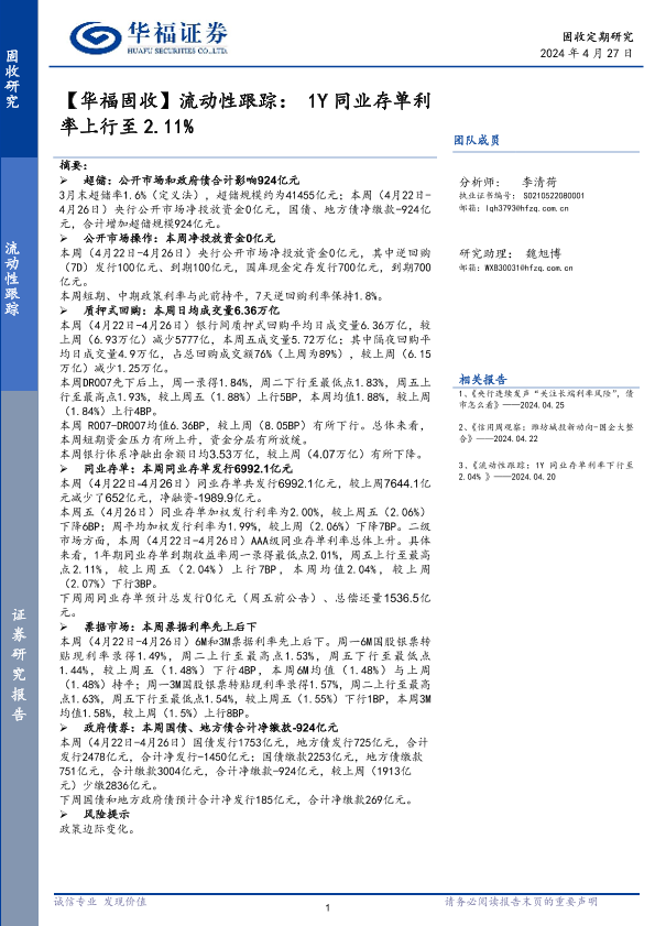 【华福证券】【20240427】【华福固收】流动性跟踪:1Y同业存单利率上行至2.11%-13页