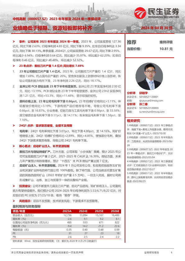 【民生证券】【20240430】中钨高新(000657)2023年年报及2024年一季报点评:业绩略低于预期,资源短板即将补齐-16页