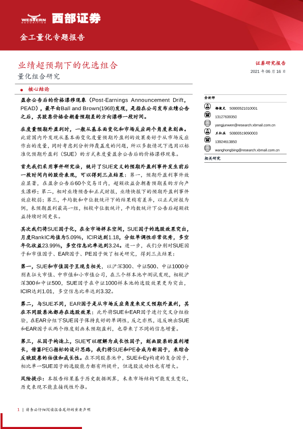 【西部证券】【20210616】量化组合研究:业绩超预期下的优选组合-26页