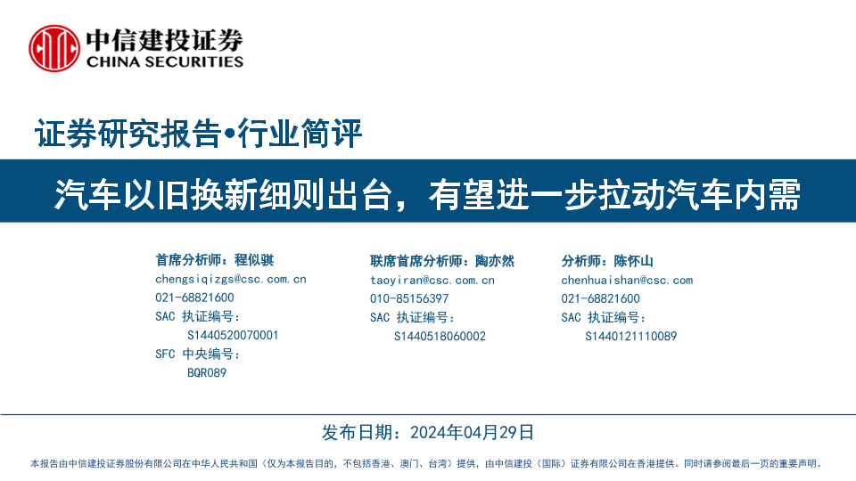 【中信建投证券】【20240429】乘用车行业:汽车以旧换新细则出台+有望进一步拉动汽车内需-21页