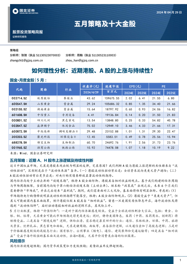 【国金证券】【20240429】五月策略及十大金股:如何理性分析,近期港股、A股的上涨与持续性?-11页