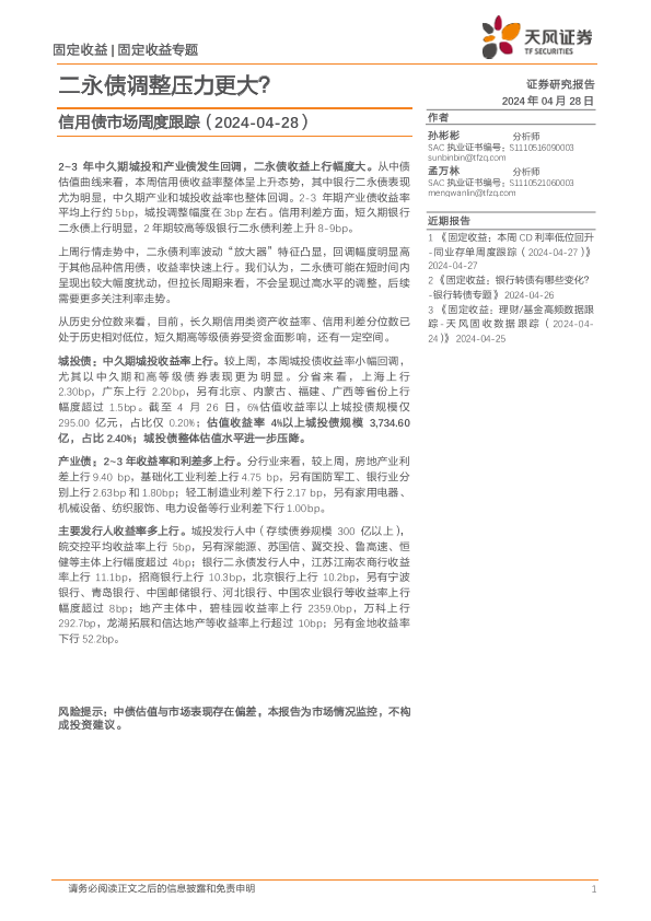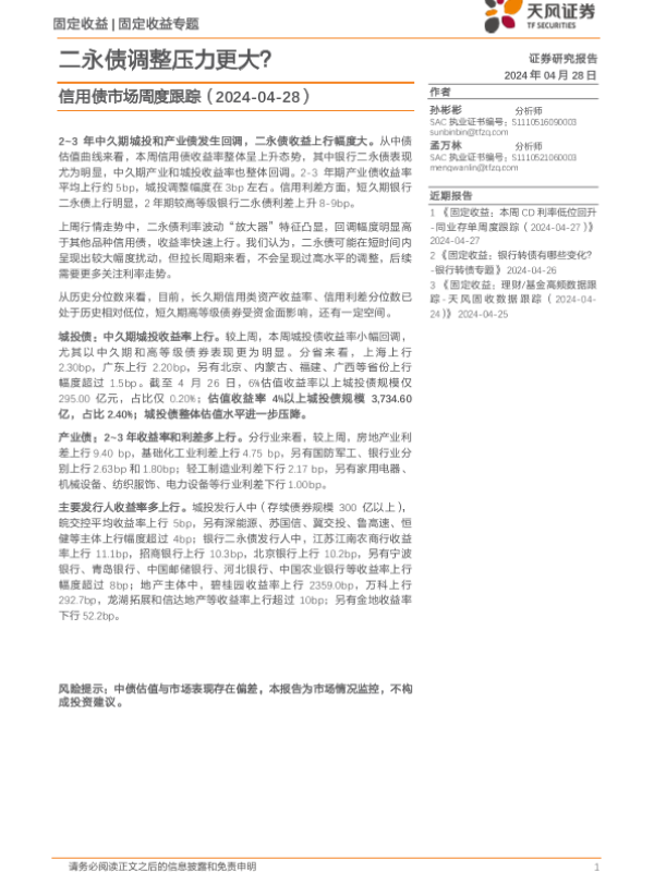 【天风证券】【20240428】信用债市场跟踪:二永债调整压力更大?-13页