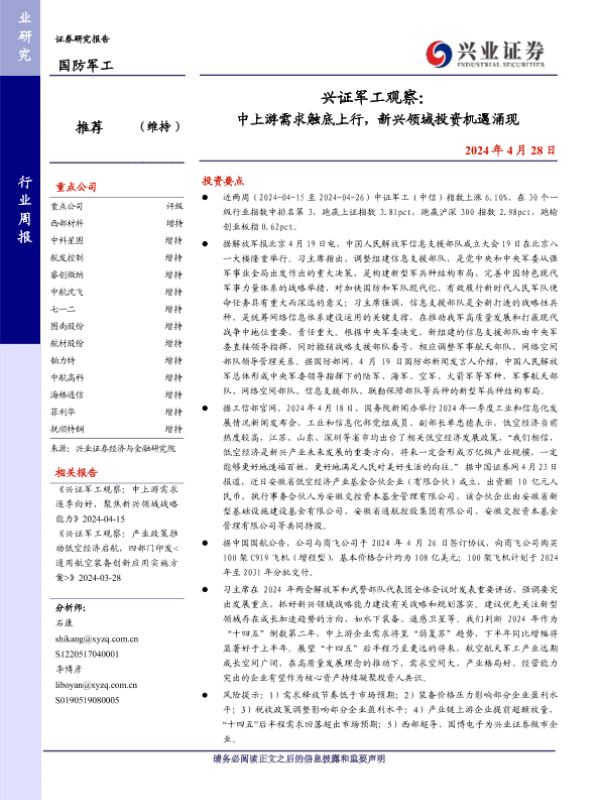 【兴业证券】【20240428】兴证军工观察:中上游需求触底上行,新兴领域投资机遇涌现-31页