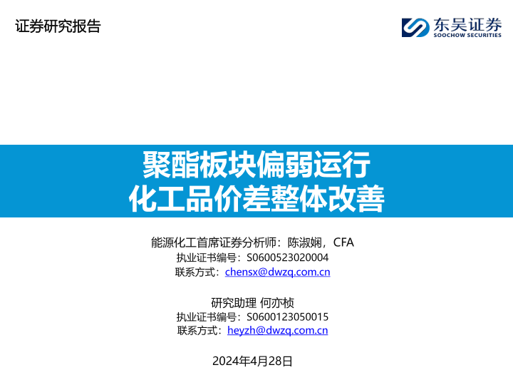 【东吴证券】【20240428】化工行业:聚酯板块偏弱运行,化工品价差整体改善-43页