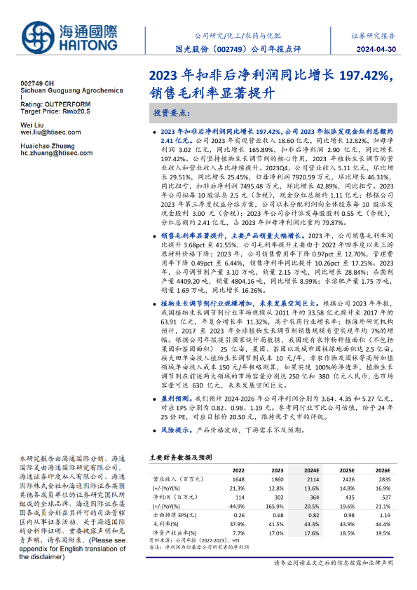 【海通国际】【20240429】国光股份(002749)2023年扣非后净利润同比增长197.42%,销售毛利率显著提升-12页