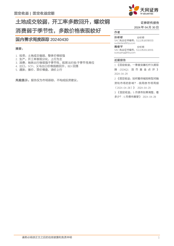 【天风证券】【20240430】国内需求跟踪:土地成交较弱,开工率多数回升,螺纹钢消费弱于季节性,多数价格表现较好-10页