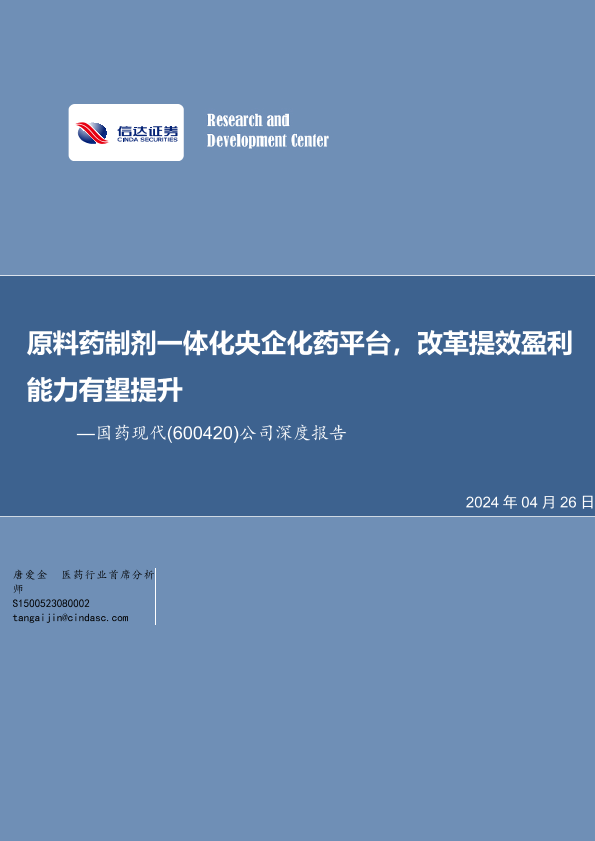 【信达证券】【20240426】国药现代-600420.SH-公司深度报告:原料药制剂一体化央企化药平台,改革提效盈利能力有望提升-35页