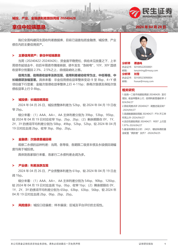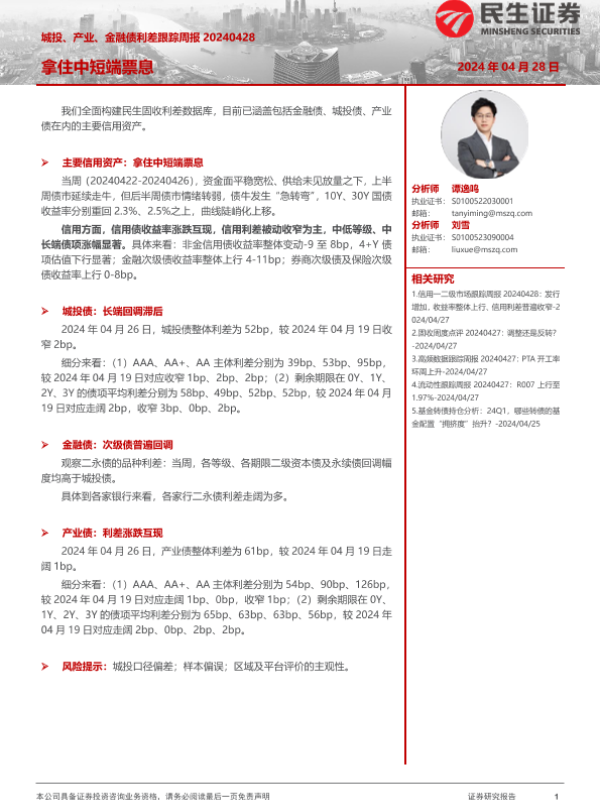 【民生证券】【20240428】城投、产业、金融债利差跟踪:拿住中短端票息-20页