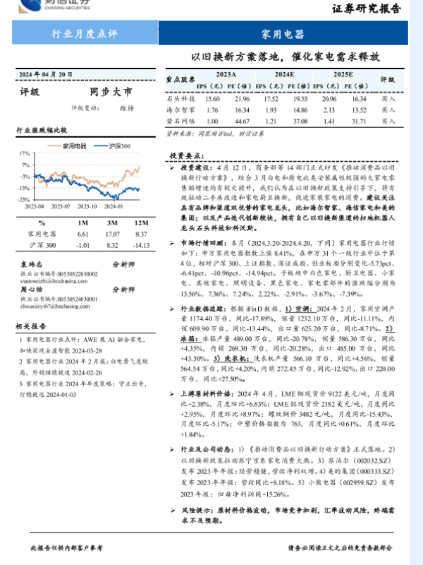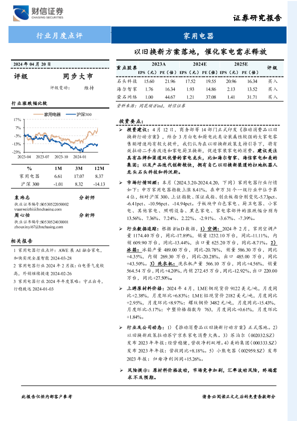 【财信证券】【20240420】家用电器行业月度点评:以旧换新方案落地,催化家电需求释放-13页