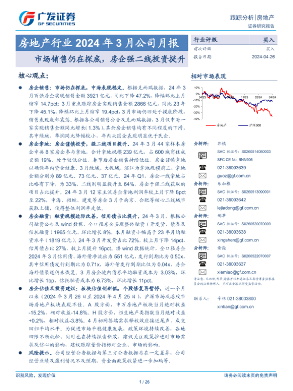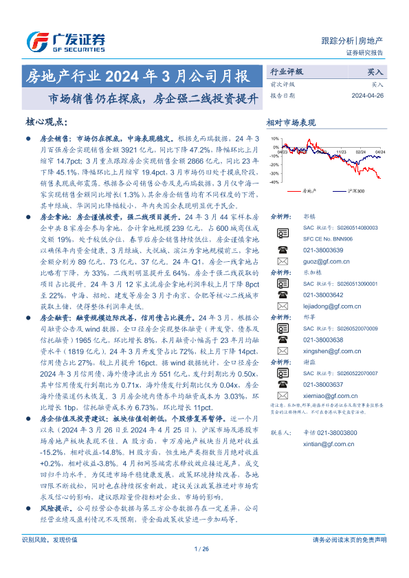 【广发证券】【20240426】房地产行业2024年3月公司月报:市场销售仍在探底,房企强二线投资提升-26页