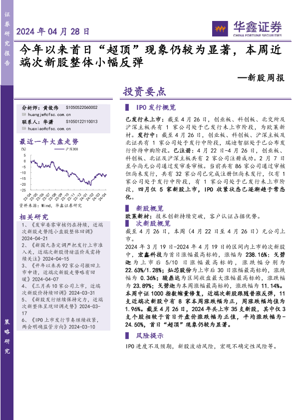 【华鑫证券】【20240428】今年以来首日“超顶”现象仍较为显著,本周近端次新股整体小幅反弹-10页