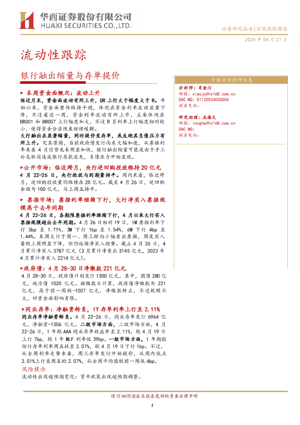 【华西证券】【20240427】流动性跟踪:银行融出缩量与存单提价-21页