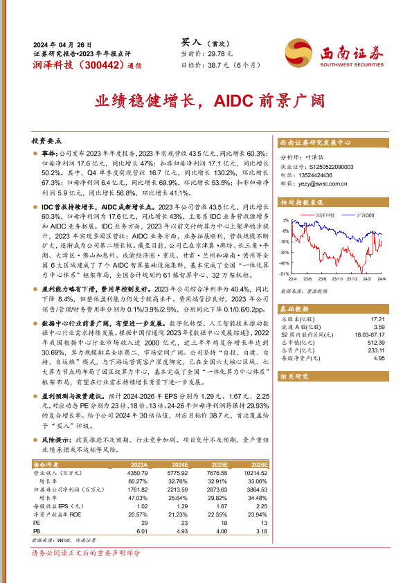 【西南证券】【20240426】润泽科技-2023年年报点评:业绩稳健增长,AIDC前景广阔-14页