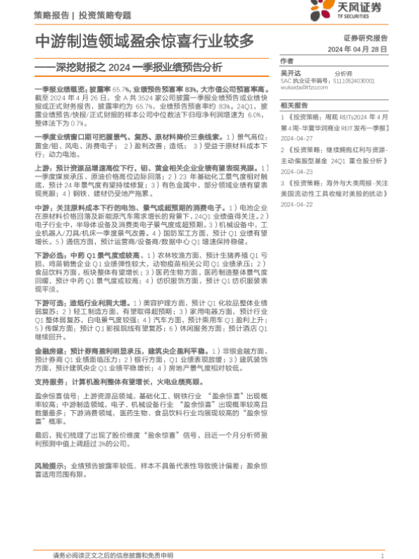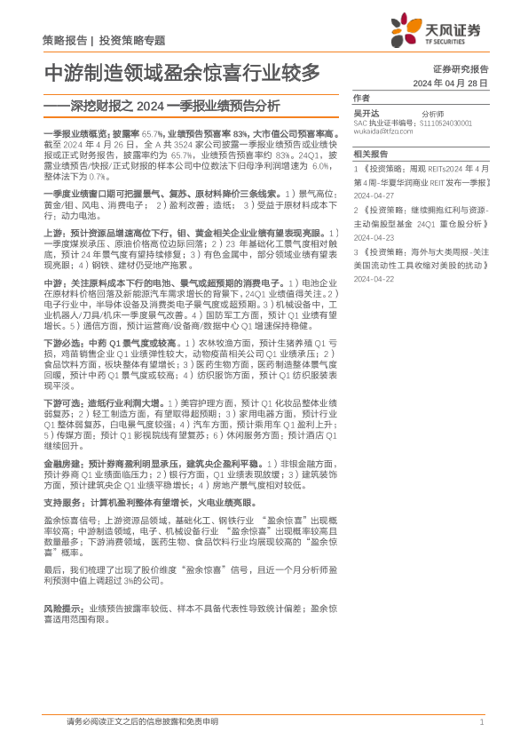 【天风证券】【20240428】深挖财报之2024一季报业绩预告分析:中游制造领域盈余惊喜行业较多-23页