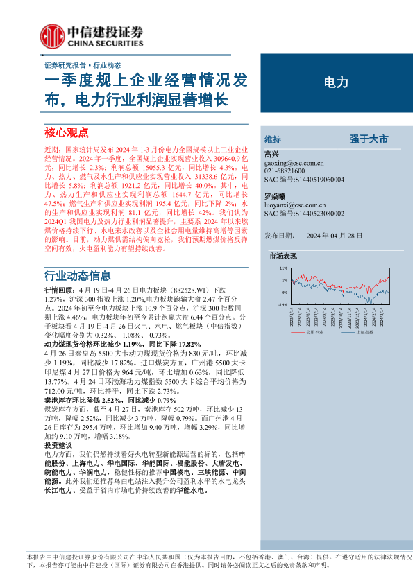 【中信建投证券】【20240428】电力行业:一季度规上企业经营情况发布,电力行业利润显著增长-19页