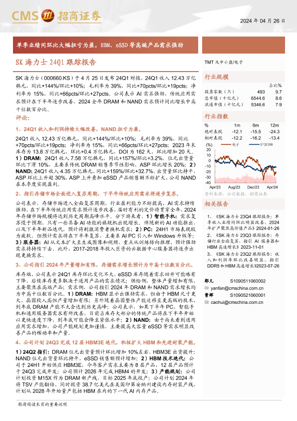 【海通证券】【20240426】电子行业SK海力士24Q1跟踪报告:单季业绩同环比大幅扭亏为盈,HBM、eSSD等高端产品需求强劲-11页