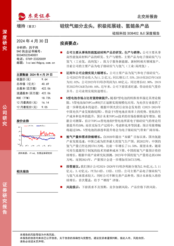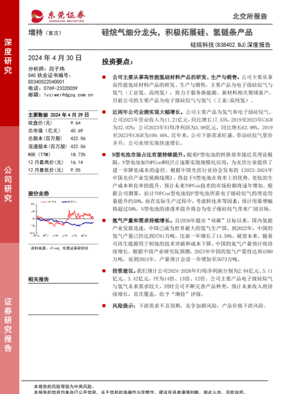 【东莞证券】【20240430】硅烷科技(838402)深度报告:硅烷气细分龙头,积极拓展硅、氢链条产品-20页