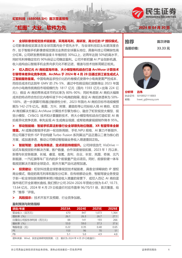 【民生证券】【20240430】虹软科技(688088)首次覆盖报告:“虹图”大业,软件为先-23页