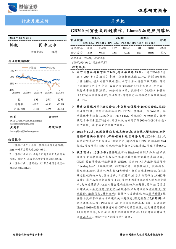 【财信证券】【20240422】计算机行业月度点评:GB200出货量或远超前作,Llama3加速应用落地-16页