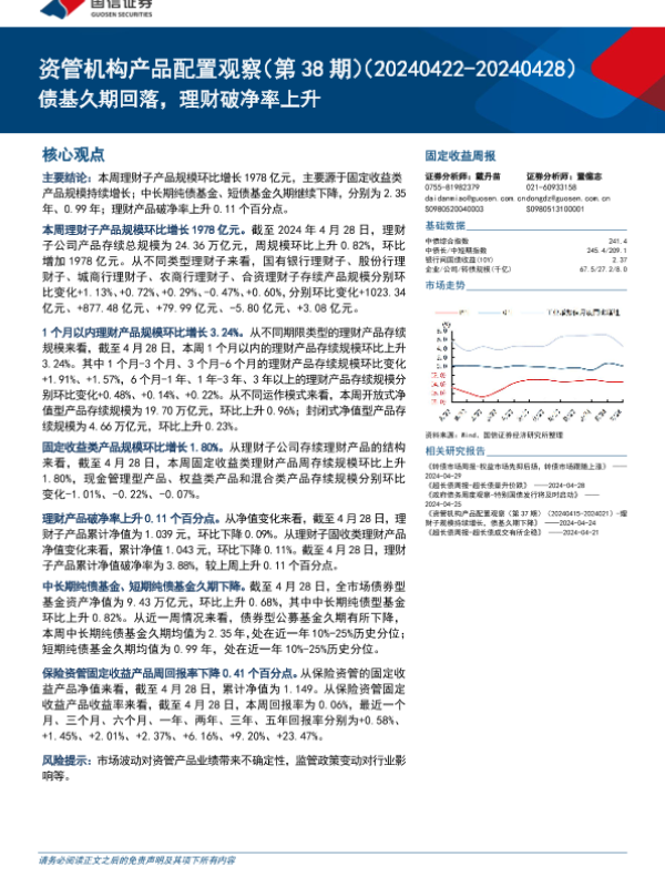 【国信证券】【20240430】资管机构产品配置观察(第38期):债基久期回落,理财破净率上升-16页