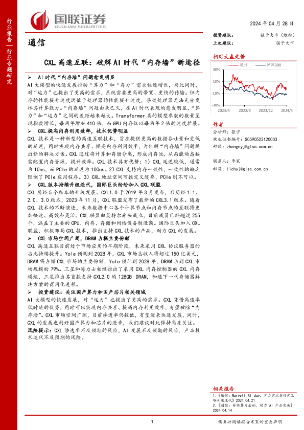 【国联证券】【20240428】通信行业专题研究:CXL高速互联,破解AI时代“内存墙”新途径-11页