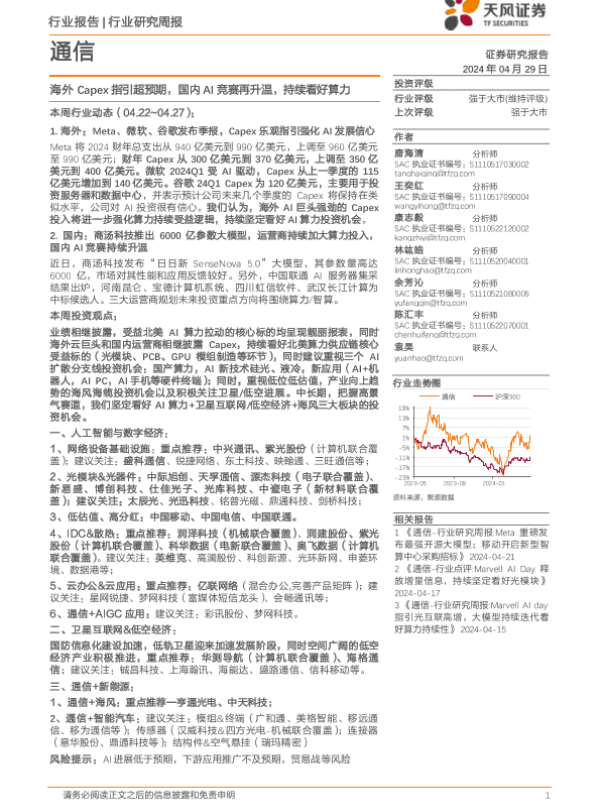 【天风证券】【20240429】通信行业报告:海外Capex指引超预期,国内AI竞赛再升温,持续看好算力-12页